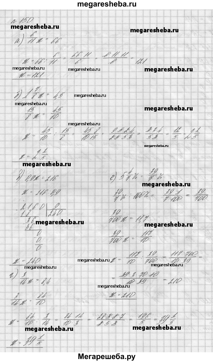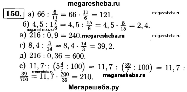 150. Найдите число: а) 6/11 которого равны 66; б) 1*7/8 которого равны 4,5; в) 0,9 которого равны 216; г) 3/14 которого равны 8,4; д) 36% которого равны 216; е) 5*4/7% которого равны 11,7.