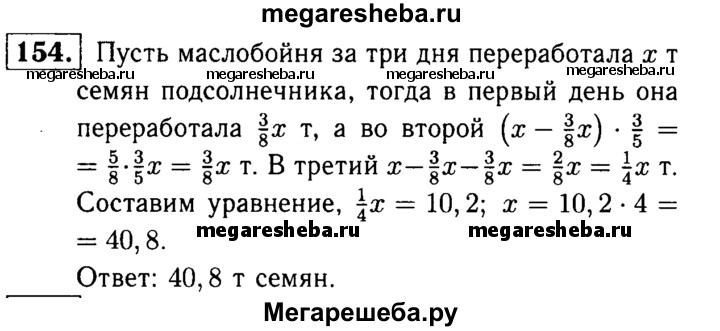 154. В первый день маслобойня переработала 3/8 поступивших семян подсолнечника, во второй день 3/5 остатка, а в третий день — остальные 10,2 т. Сколько тонн семян подсолнечника переработала маслобойня за эти три дня?