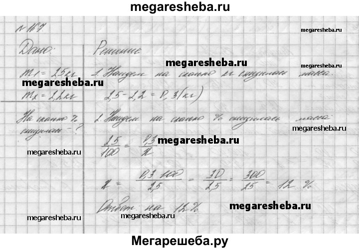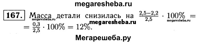 167. Масса детали в результате обработки снизилась с 2,5 кг до 2,2 кг. На сколько процентов снизилась масса детали?
