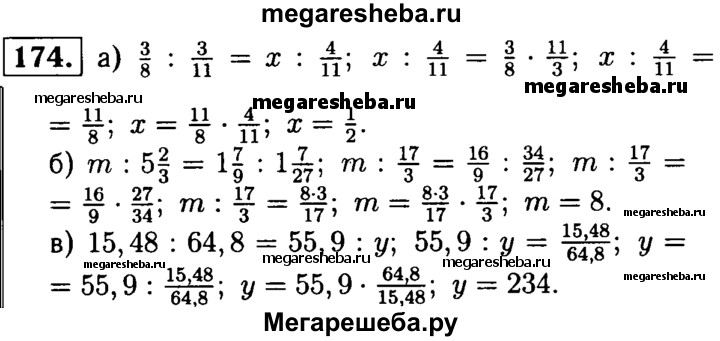 174. Решите уравнение: а) 3/8 ^ 3/11 = х : 4/11; б) m : 5*2/3 = 1*7/9 : 1*7/27; в) 15,48 : 64,8 = 55,9 : у.