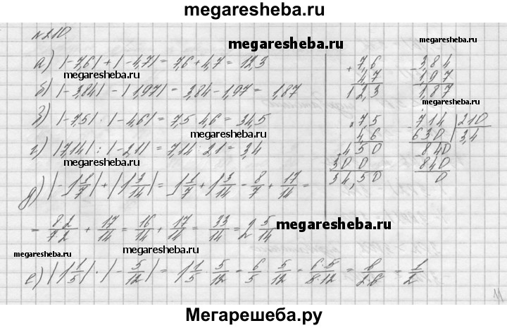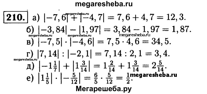 210. Найдите значение выражения: а) |-7,6 | + |-4,7|; б) |-3,8 | - |-1,97|; в) |-7,5 |* |-4,6|; г) |-7,14 |+ |-2,1|; д) |-1*1/7 |+ |1*3/14|; е) |1*1/5 |* |-5/12|.