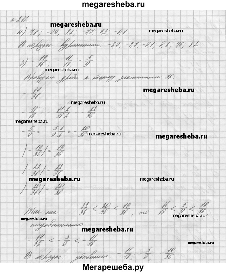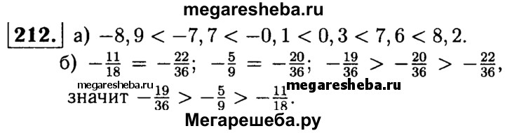 212. Расположите числа: а) 7,6; -8,9; 8,2; -7,7; 0,3; -0,1 в порядке возрастания; б)-19/36; -11/18 ; -5/9 порядке убывания.
