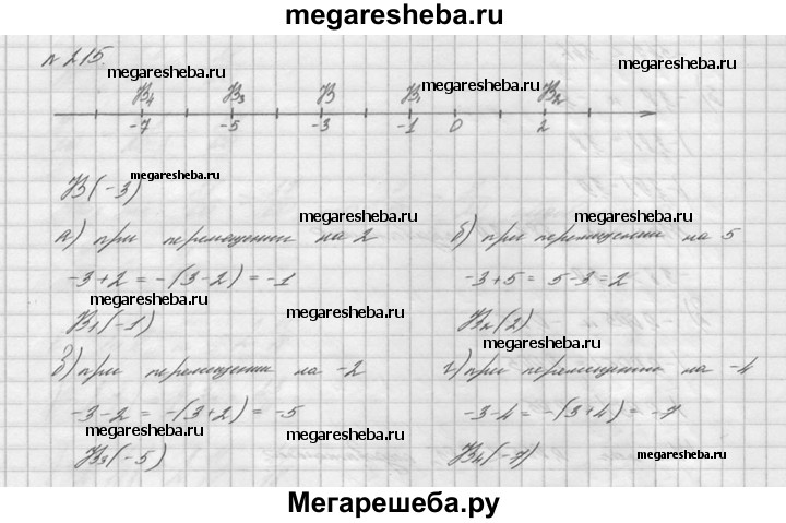 215. Отметьте на координатной прямой точку В(-3). Найдите координату точки, в которую перейдет точка В при перемещении: а) на 2; б) на 5; в) на -2; г) на -4.
