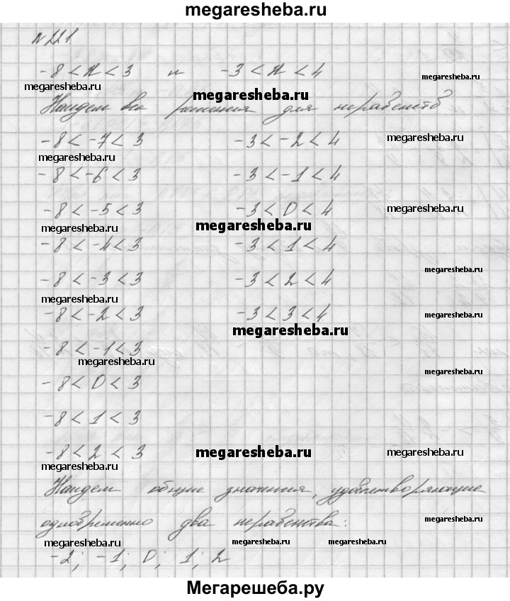 221. Запишите все целые числа, которые являются решениями одновременно двух неравенств -8 < х < 3 и -3 < х < 4.