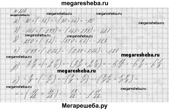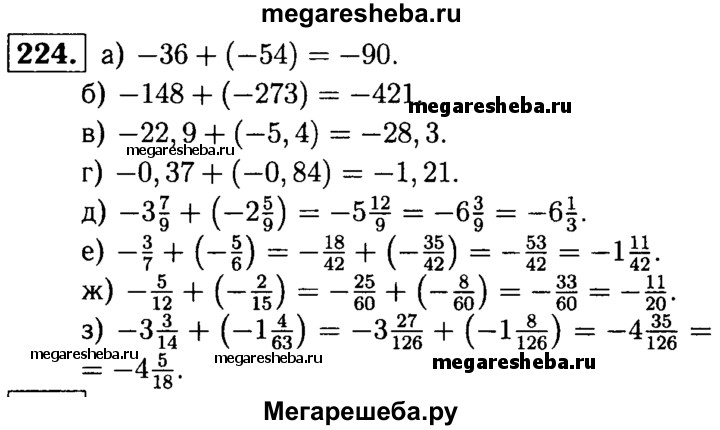 224. Найдите значение суммы: а) -36 + (-54); б) -148 + (-273); в) -22,9 + (-5,4); г) -0,37 + (-0,84); д) -3*7/9 + (-2*5/9); е) -3/7 + (-5/6); ж) -5/12 + (-2/15); з) -3*3/14 + (-1*4/63).