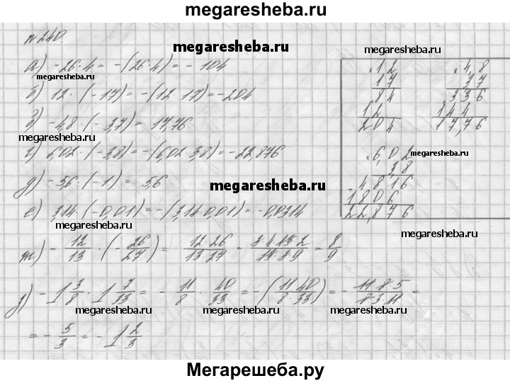 240. Выполните умножение: а) -26 – 4; б) 12 * (-17); в) -4,8 * (-3,7); г) 6,02 * (-3,8); д) -5,6 * (-1); е) 3,14 * (-0,01); ж) -12/13 * (-26/27); з) -1*3/8 * 1*7/33.
