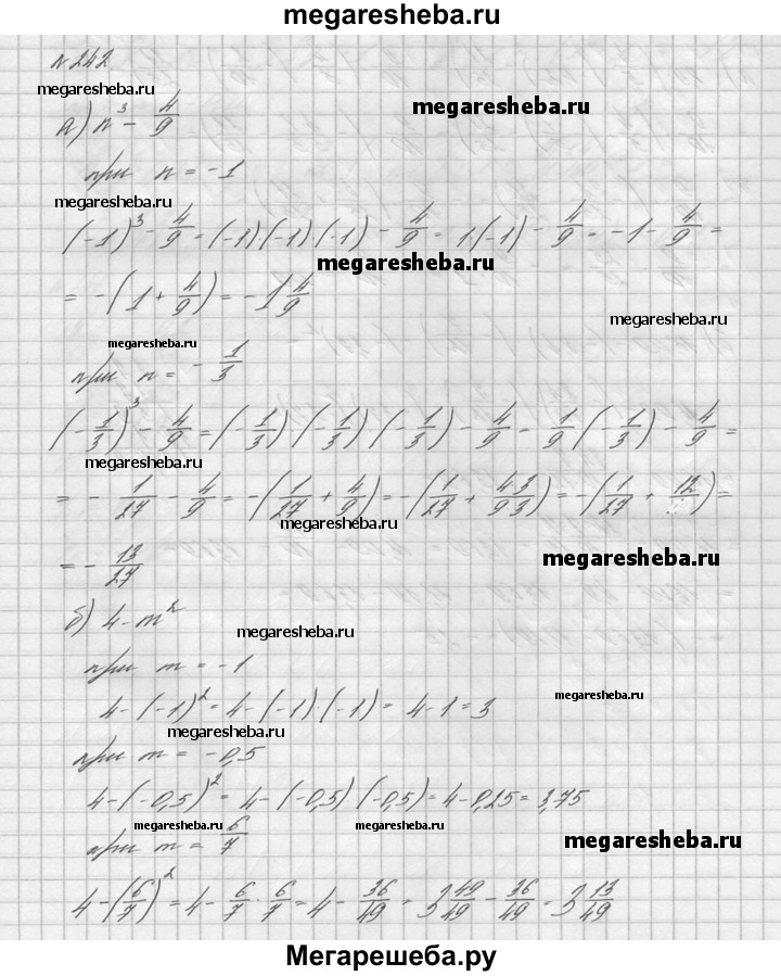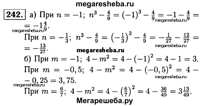 242. Найдите значение выражения: а) n3 – 4/9, если n = -1; n = -1/3; б) 4 - m2, если m = -1; m = -0,5; m = 6/7.
