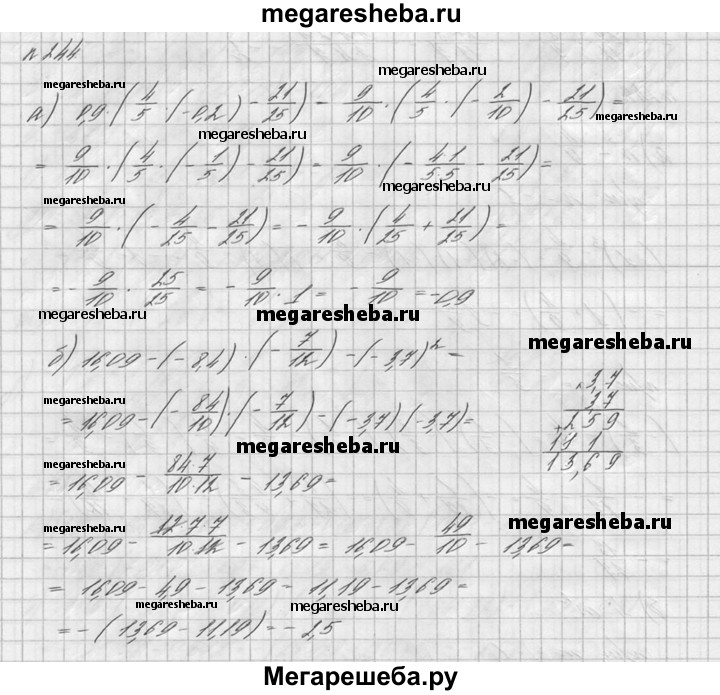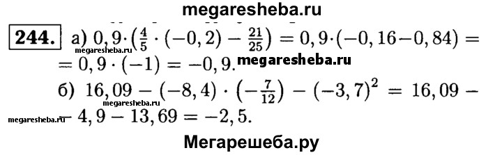 244. Выполните действия: а) 0,9 * (4/5 * (-0,2) – 21/25); б) 16,09 - (-8,4) * (-7/12) - (-3,7)2.