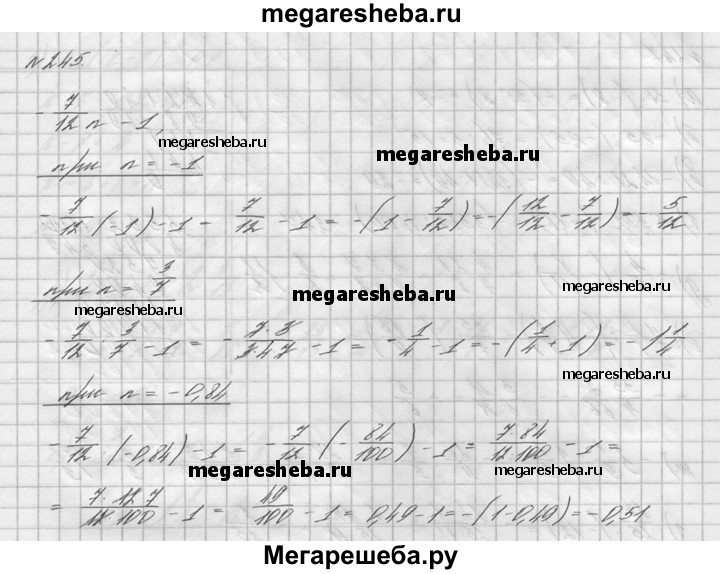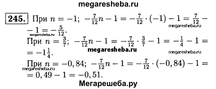 245. Найдите значение выражения 7/12n - 1, если n = -1; n = 3/7; n = -0,84.