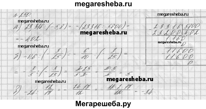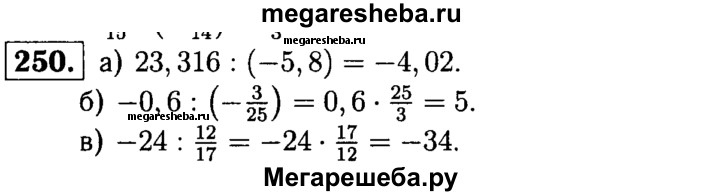 250. Выполните деление: а) 23,316 : (-5,8); б) -0,6 : (-3/25); в) -24 : 12/17.