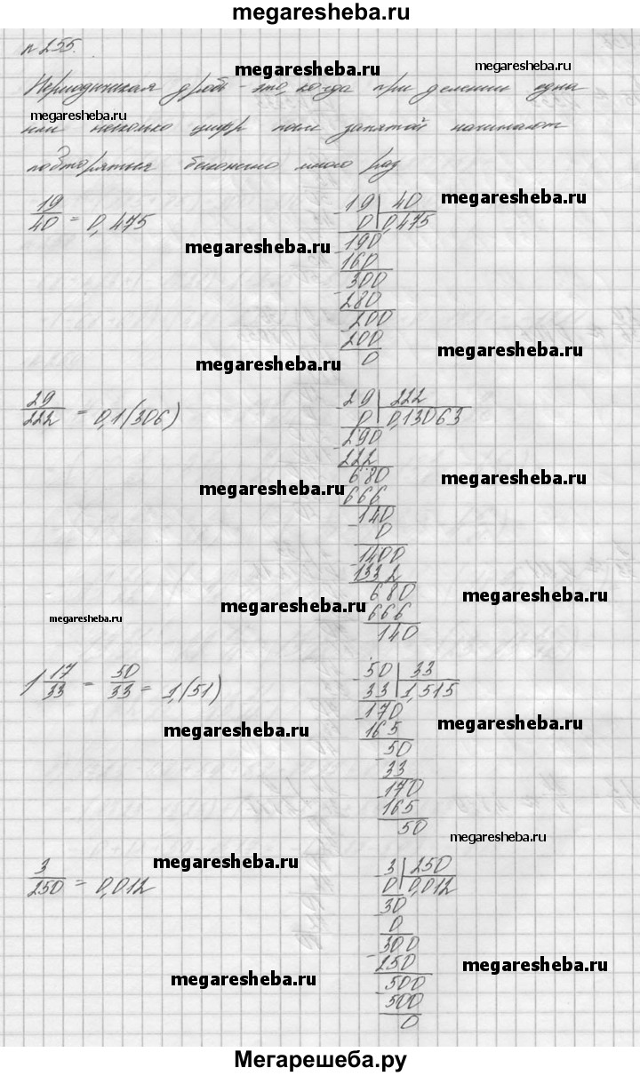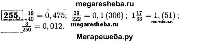 255. Выразите в виде десятичной или периодической дроби числа 19/40, 29/222, 1*17/33, 3/250.