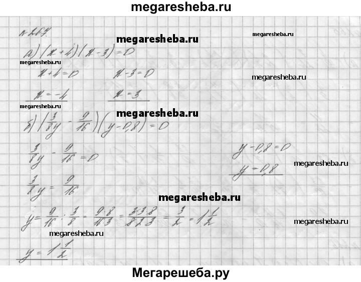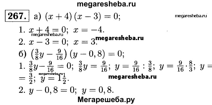 267. Решите уравнение: а) (х + 4) (х - 3) = 0; б) (3/8у – 9/16)(у - 0,8) = 0.