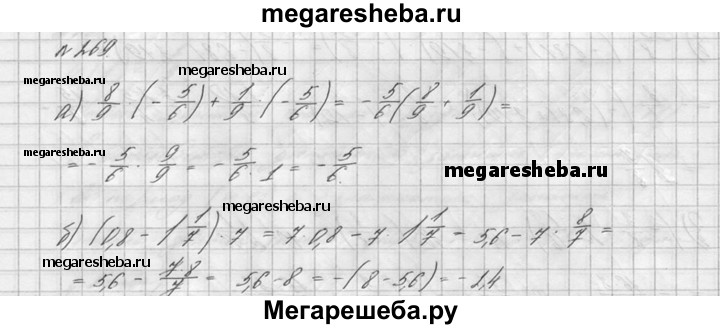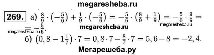 269. Найдите значение выражения, применив распределительное свойство умножения: а) 8/9 * (-5/6) + 1/9 * (-5/6) б) (0,8 – 1*1/7) * 7.