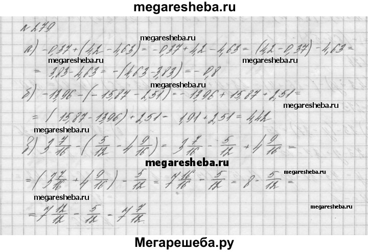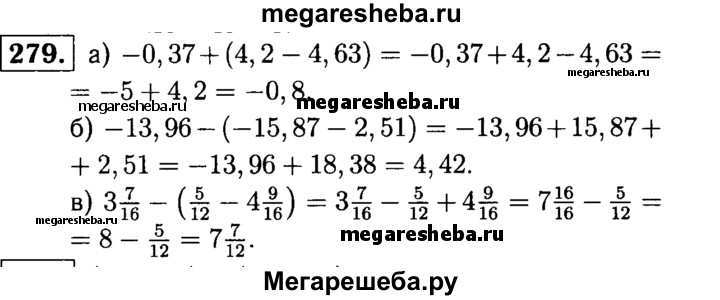 279. Раскройте скобки и найдите значение выражения: а) -0,37 + (4,2 - 4,63); б) -13,96 - (-15,87 - 2,51); в) 3*7/16 – (5/12 – 4*9/16).
