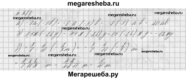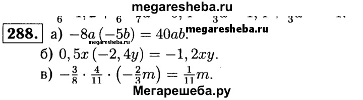 288. Упростите выражение: а) -8а (-5b); б) 0,5x (-2,4 у); в) -3/8 * 4/11 * (-2/3m).