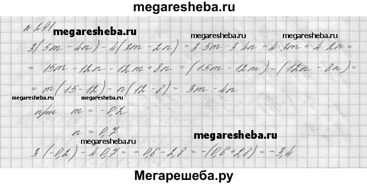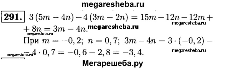 291. Найдите значение выражения 3 (5m – 4n) - 4 (3m – 2n), если m = -0,2, n = 0,7.