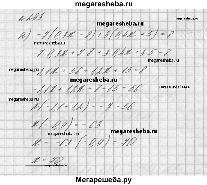 293. Найдите корень уравнения: а) -7 (0,3x - 8) + 3 (0,4x + 5) = 8; б) 43,2(11/18x – 7/8) - 25,5(9/17x – 2/3) = - 59,5.