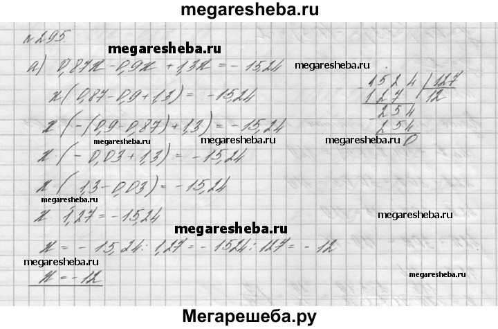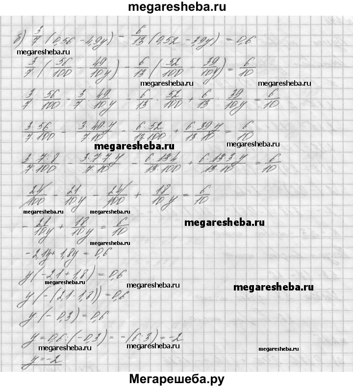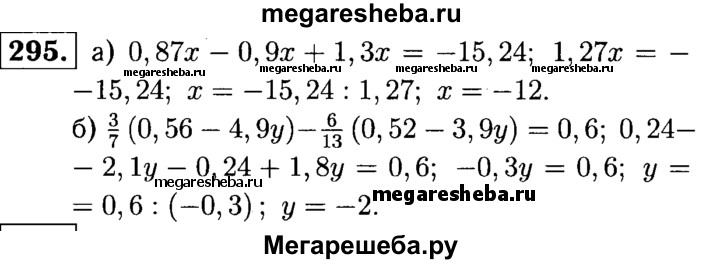 295. Решите уравнение: а) 0,87x - 0,9x + 1,3x = -15,24; б) 3/7 (0,56 - 4,9у) – 6/13 (0,52 - 3,9у) = 0,6.