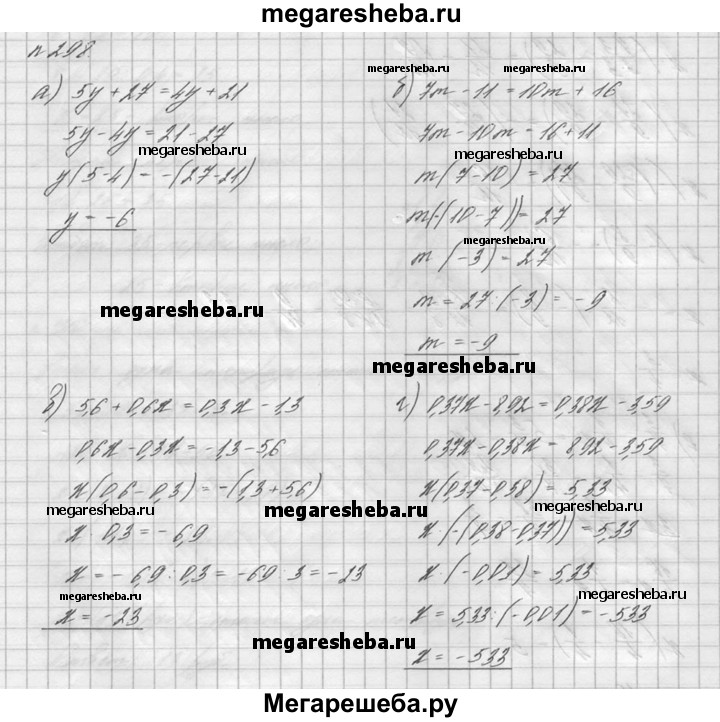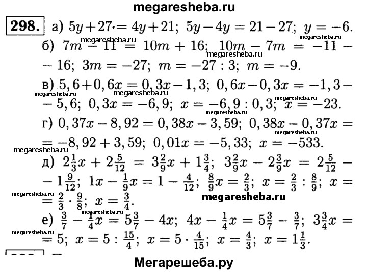 298. Решите уравнение: а) 5у + 27 = 4у + 21; б) 7m - 11 = 10m + 16; в) 5,6 + 0,6x = 0,3x - 1,3; г) 0,37x - 8,92 = 0,38x - 3,59; д) 2*1/3х + 2*5/12 = 3*2/9х + 1*3/4; е) 3/7 – 1/4x = 5*3/7 - 4x.