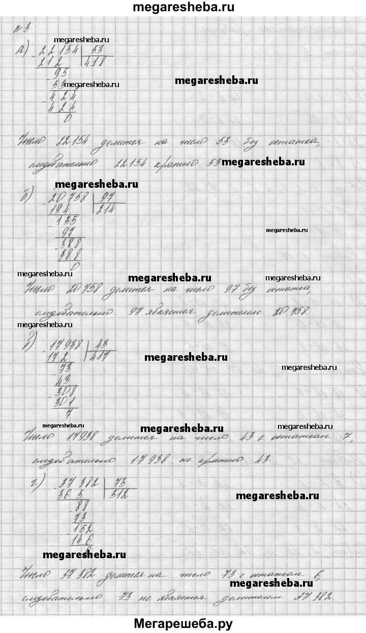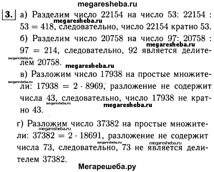 3. Докажите, что: а) 22 154 кратно 53; б) 97 является делителем 20 758; в) 17 938 не кратно 43; г) 73 не является делителем 37 382.