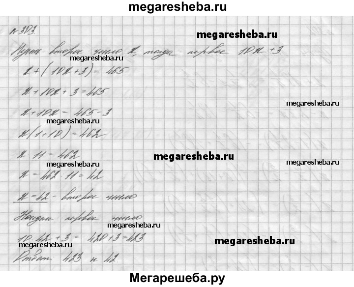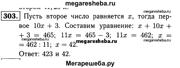 303. Сумма двух натуральных чисел 465. Одно из них оканчивается цифрой 3. Если эту цифру зачеркнуть, то получится второе число. Найдите эти числа.