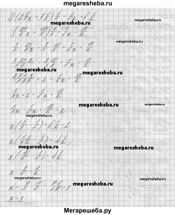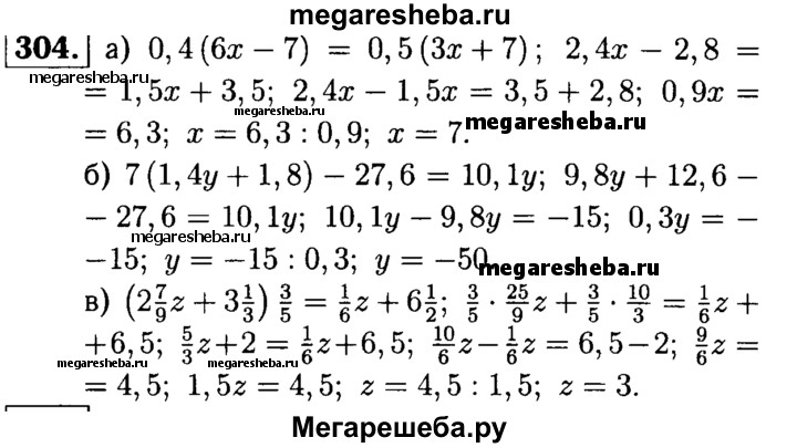 304. Решите уравнение: а) 0,4 (6x - 7) = 0,5 (3x + 7); б) 7(1,4у + 1,8) - 27,6 = 10,1у; в) (2*7/9z + 3*1/3)3/5 = 1/6z + 6*1/2.