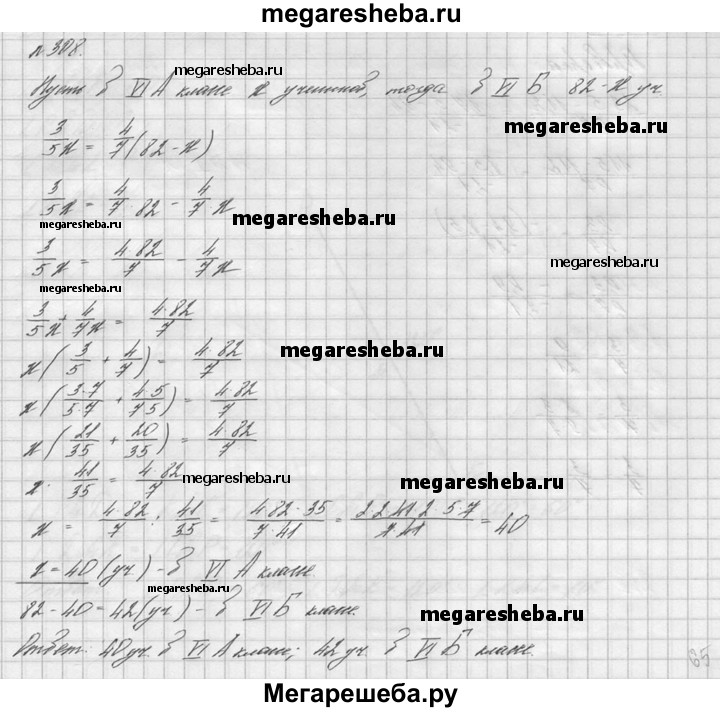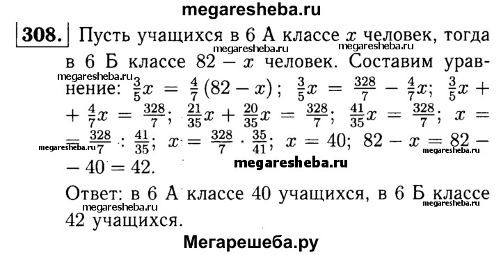 308. В двух классах VI А и VI Б вместе 82 ученика. Известно, что мальчиков в этих классах поровну. Мальчики в VI А классе составляют 3/5 учащихся своего класса, а мальчики VI Б составляют 4/7 учащихся своего класса. Сколько учащихся в каждом из этих классов?