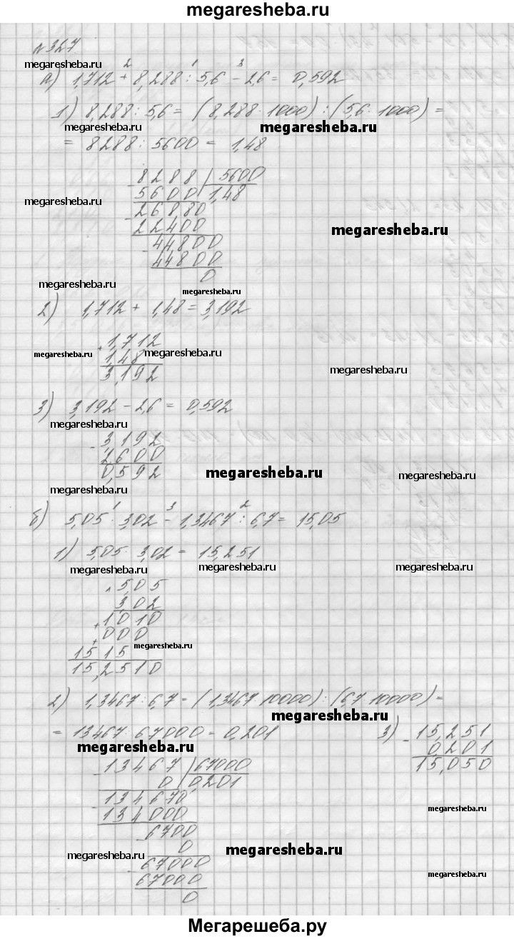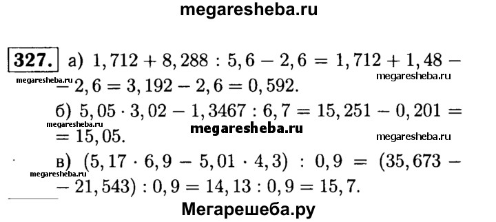 327. Выполните действия: а) 1,712 + 8,288 : 5,6 - 2,6; б) 5,05 * 3,02 - 1,3467 : 6,7; в) (5,17 * 6,9 - 5,01-4,3): 0,9.