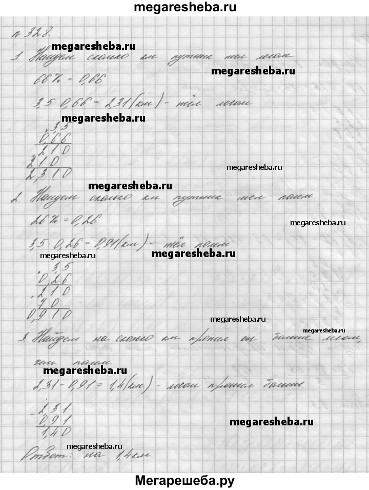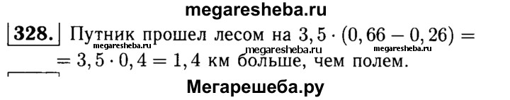 328. Чтобы попасть из села на железнодорожную станцию, путнику пришлось пройти 3,5 км. Из них 66% он шел лесом, 26% — полем, а остальной путь проходил по поселку. На сколько километров прошел он больше лесом, чем полем?