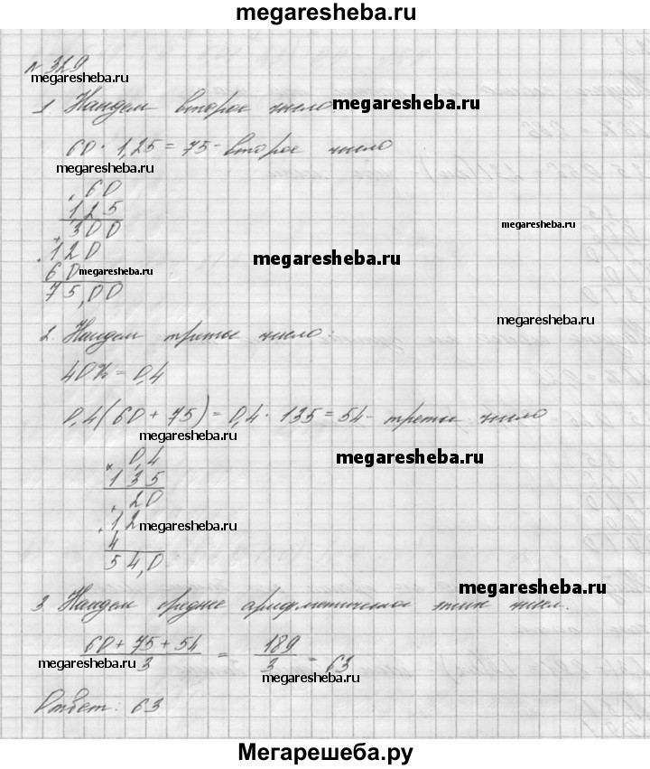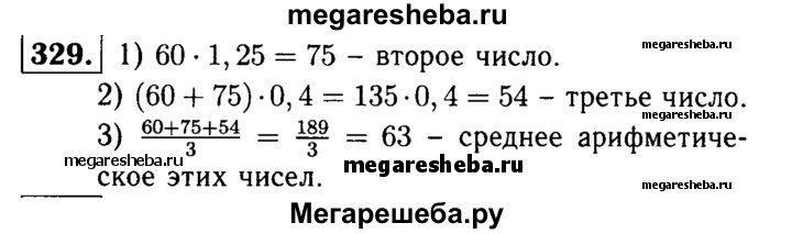 329. Первое число равно 60, второе в 1,25 раза больше первого, а третье составляет 40% суммы первого и второго. Найдите среднее арифметическое этих чисел.