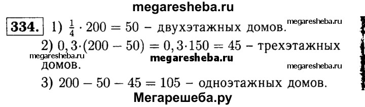 334. В поселке 200 домов. Двухэтажные дома составляют 1/4 всех домов. Трехэтажные дома составляют 0,3 оставшихся домов, а остальные дома одноэтажные. Сколько одноэтажных домов в поселке?