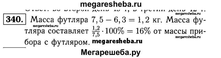 340. Прибор вместе с футляром имеет массу 7,5 кг. Масса прибора 6,3 кг. Сколько процентов от массы прибора с футляром составляет масса футляра?