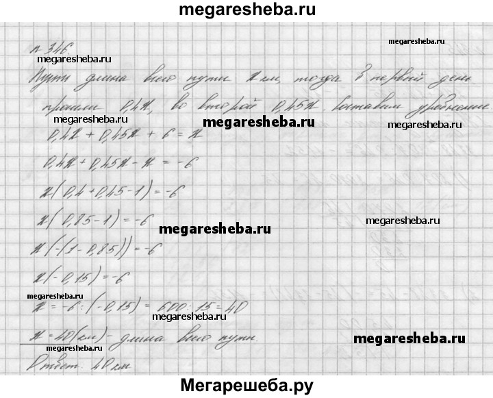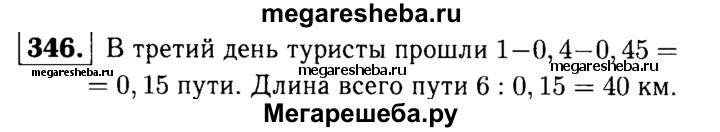 346. Туристы были в походе три дня. В первый день они прошли 40% всего намеченного пути, а во второй день 0,45 пути. В третий день туристы прошли оставшиеся 6 км. Найдите длину всего пути.