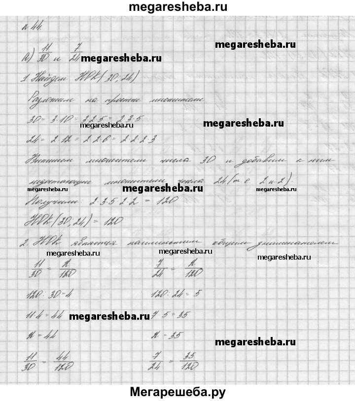 44. Приведите к наименьшему общему знаменателю дроби: а) 11/30 и 7/24; б) 9/34 и 8/51; в) 9/14, 10/21 и 15/28.
