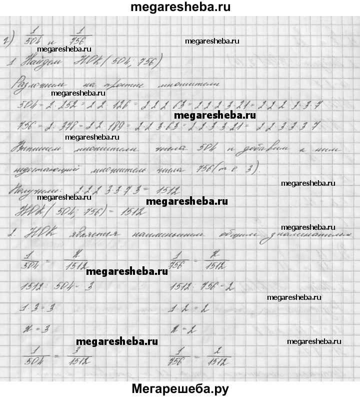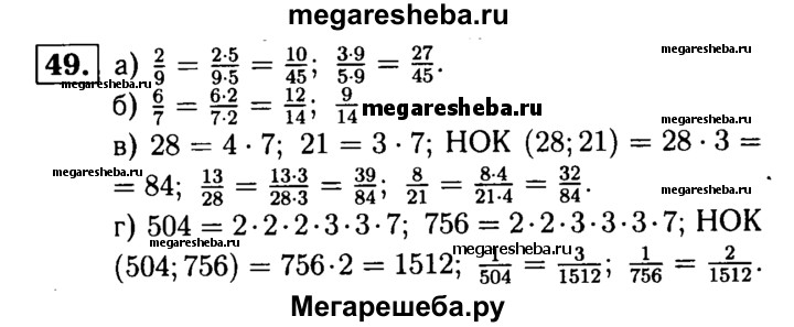 49. Приведите к наименьшему общему знаменателю дроби: а) 2/9 и 3/5; б) 6/7 и 9/14; в) 13/28 и 8/21; г) 1/504 и 1/756.