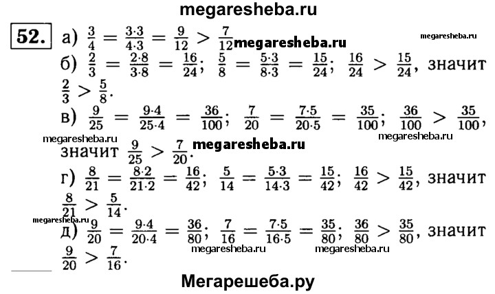 52. Сравните дроби: а) 7/12 и ¾; б) 2/3 и 5/8; в) 9/25 и 7/20; г) 8/21 и 5/14; д) 9/20 и 7/16.
