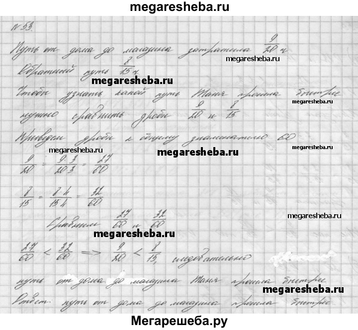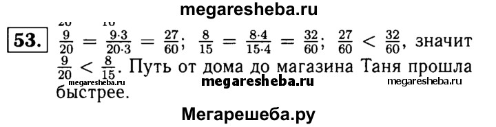 53. На путь от дома до магазина Таня затратила 9/20 ч, а на обратный путь 8/15 ч. Какой путь Таня прошла быстрее: от дома до магазина или от магазина до дома?