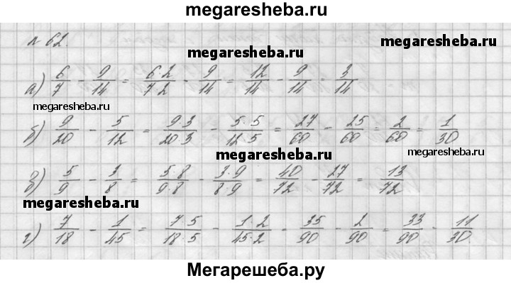 62. Выполните вычитание: а) 6/7 – 9/14; б) 9/0 -5/12; в) 5/9 – 3/8; г) 7/18 – 1/45.