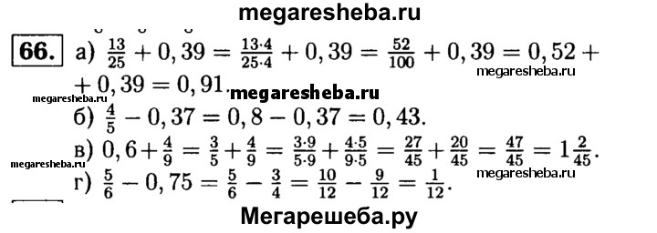 66. Выполните действие: а) 13/25 + 0,39; б) 4/5 - 0,37; в) 0,6 + 4/9; г) 5/6 - 0,75.