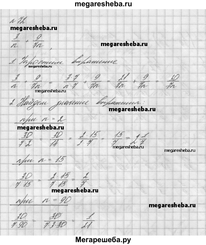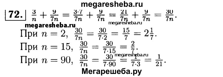 72. Упростите выражение 3/n + 9/7n и найдите его значение при n = 2; n = 15 и n = 90.