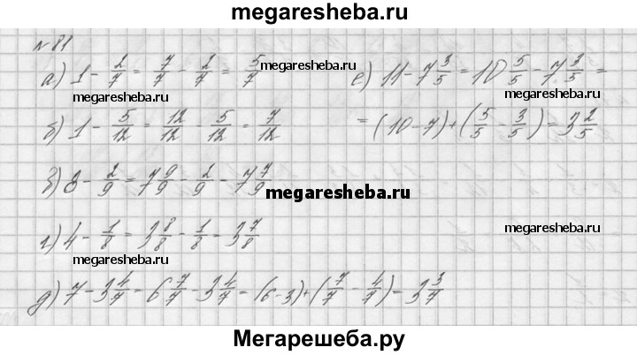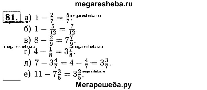 81. Выполните вычитание: а) 1-2/7; б) 1-5/12; в) 8- 2/9; г) 4-1/8; д) 7-3*4/7; е) 11-7*3/5.