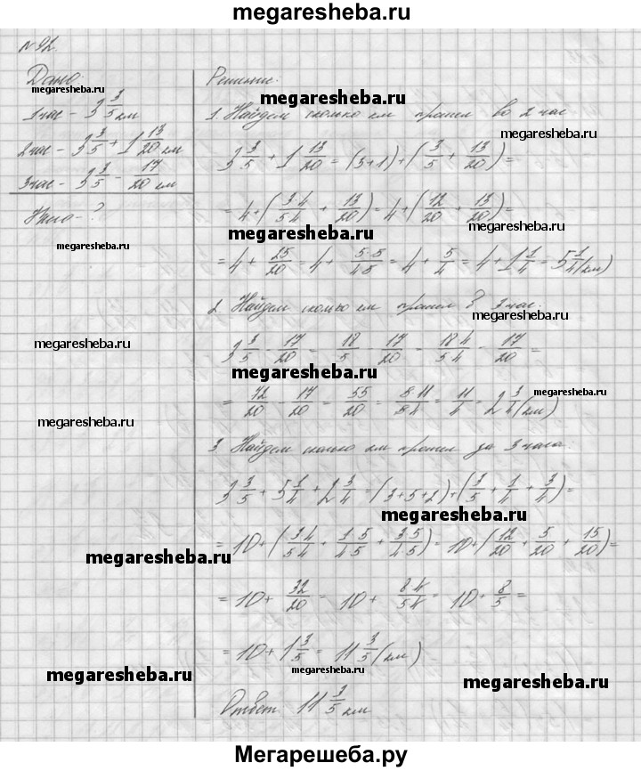 92. Путник в первый час прошел 3*3/5 км, что на 1*13/20 км меньше, чем во второй час, и на 17/20 км больше, чем в третий час. Сколько километров прошел путник за эти три часа?
