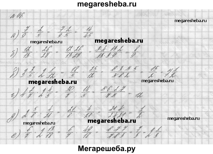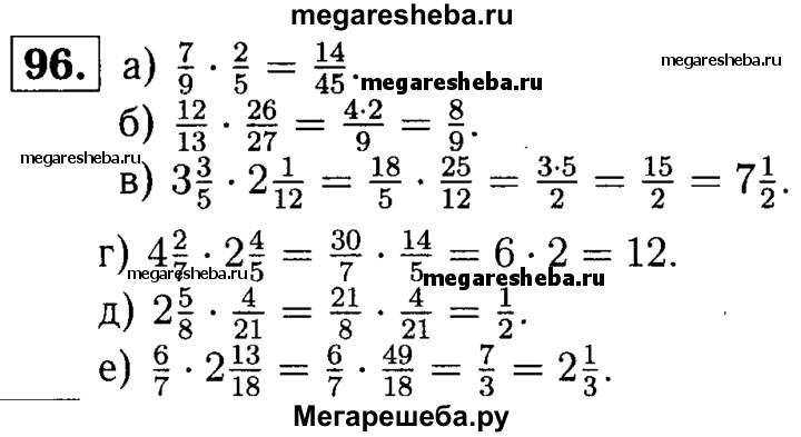 96. Выполните действие: а) 7/9 * 2/5; б) 12/13 * 26/27; в) 3*3/5 * 2*1/12; г) 4*2/7 * 2*4/5; д) 2*5/8 * 4/21; е) 6/7 * 2*13/18.