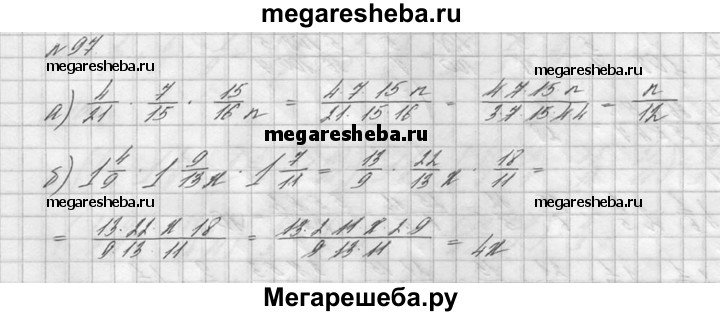 97. Упростите выражение: а) 4/21 * 7/15 * 15/16n; б) 1*4/9 * 1*9/13х * 1*7/11.