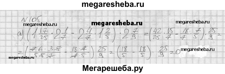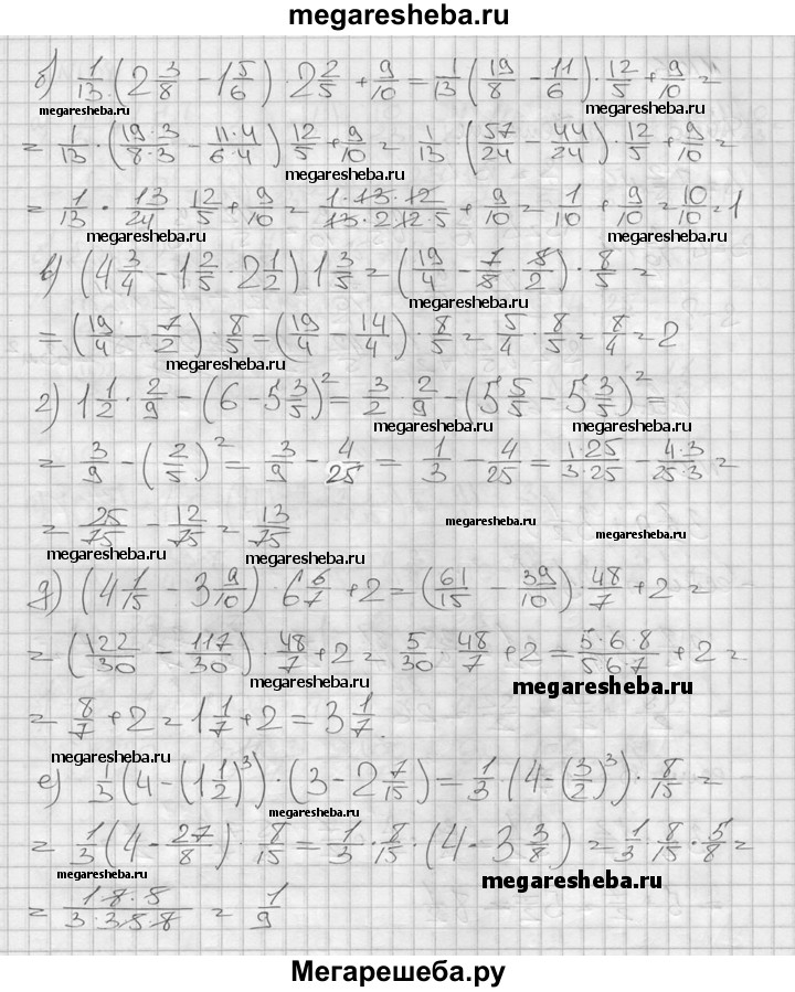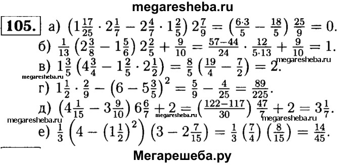 105. Найдите значение выражения: а) (1*17/25 * 2*1/7 – 2*4/7 * 1*2/5) * 2*7/9; б) 1/13 * (2*3/8 – 1*5/6) * 2*2/5 + 9/10; в) (4*3/4 – 1*2/5 * 2*1/2) * 1*3/5; г) 1*1/2 * 2/9 – (6 – 5*3/5)2; д) (4*1/15 – 3*9/10) * 6*6/7 + 2; е) 1/3 * (4-(1*1/2)3) * (3-2*7/15).