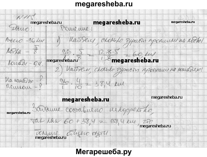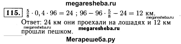 115. Чтобы добраться до следующего пункта, туристам надо было преодолеть 96 км; 5/8 этого пути они проплыли на лодке, 0,4 маршрута они проехали на лошадях, остальное прошли пешком. Сколько километров туристы проехали на лошадях? Сколько километров пришлось идти пешком?