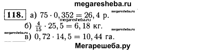 118. Найдите: а) 35,2% от 75 р.; б) 4/15 от 25,5 кг в) 0,72 от 14,5 га.
