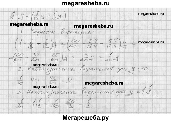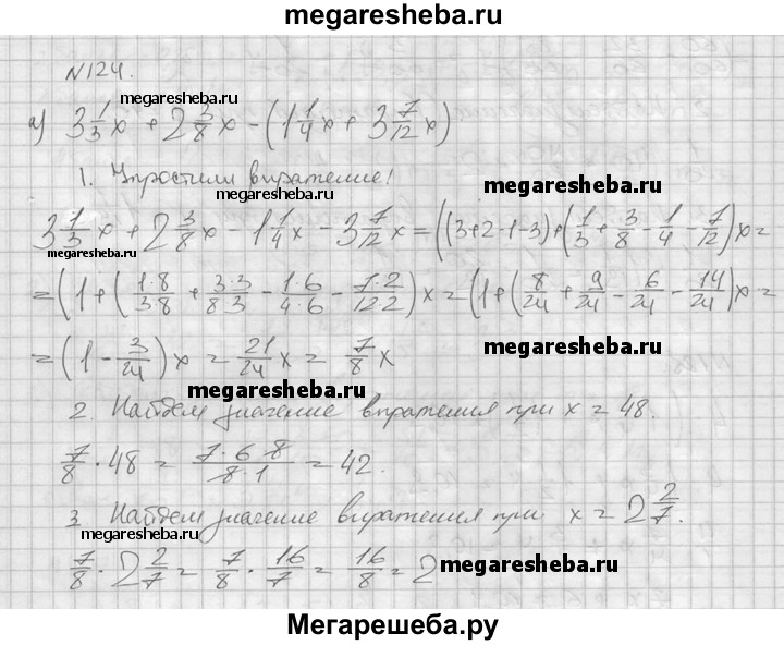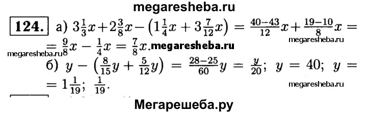 124. Найдите значение выражения: а) 3*1/3х + 2*2/3x – (1*1/4x + 3*7/12х), если х = 48; х = 2*2/7; б) y – (8/15y + 512y), если y = 40, y = 1*1/19.