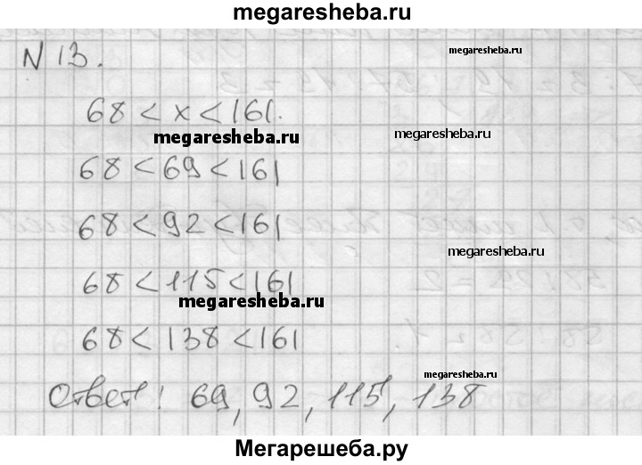 13. Найдите все числа, кратные 23, которые являются решениями неравенства 68 < х < 161.
