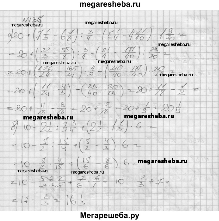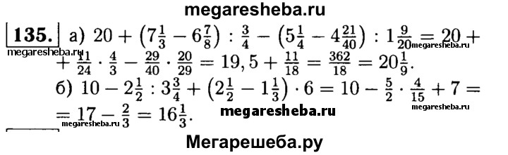 135. Выполните действия: а) 20 + (7*1/3 – 6*7/8) : 3/4 – (5*1/4 – 4*21/40) : 1*9/20; б) 10 – 2*1/2 : 3*3/4 + (2*1/2 – 1*1/3) * 6.